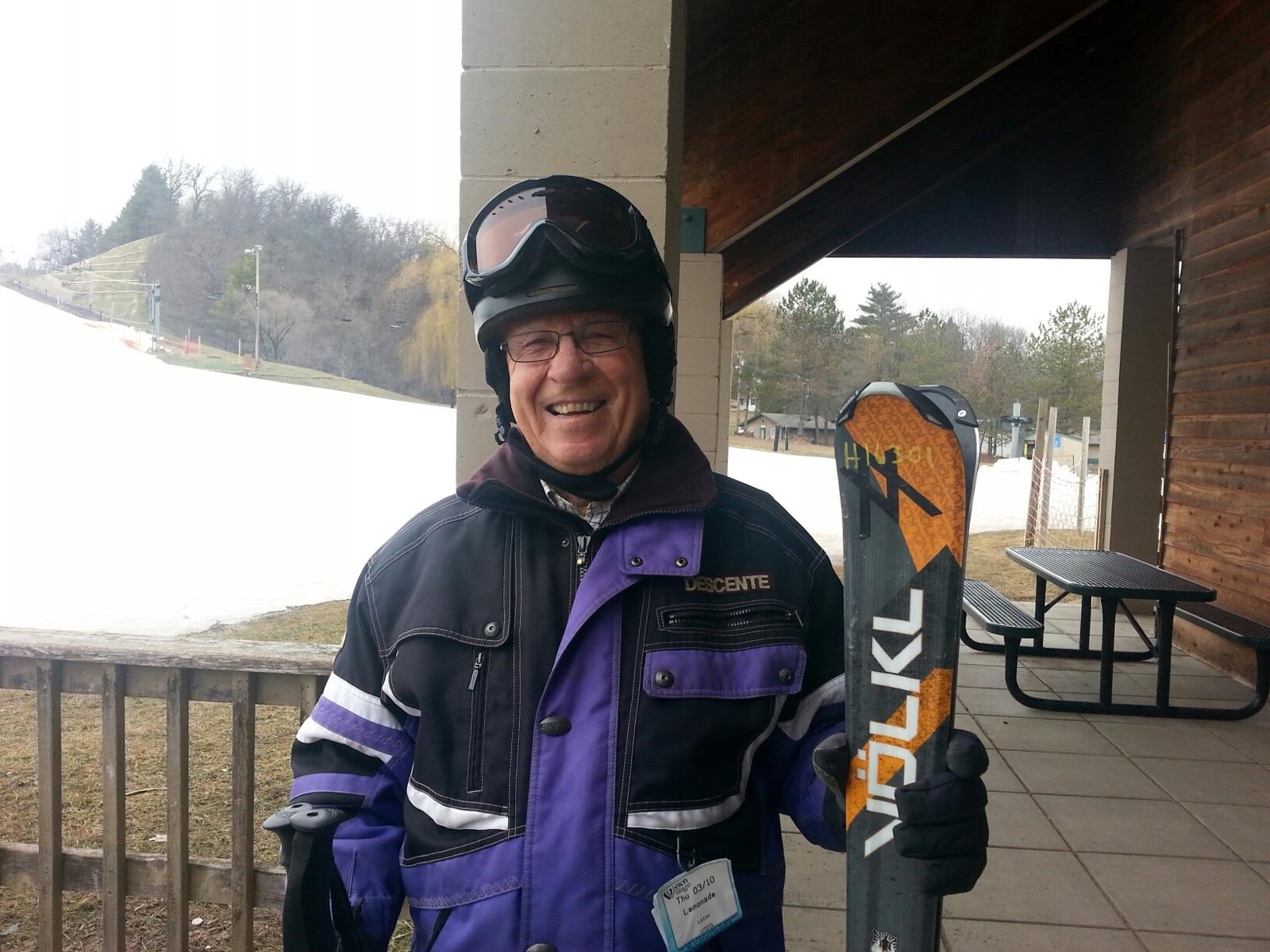 For those of you who think that this winter was too short and you were not able ski or ride as much as you would have liked....think again. Welch Village co-founder, owner, and my grandfather, Leigh Nelson (age 87), spent his 87th day on snow at yesterday. Thank you to our Ski School Director Troy Carpenter for taking this photo quick. Grandpa usually takes just a few runs a day. It's important to him that he rides every chairlift that is running that particular day. He also likes to test the snow conditions to see for himself how the snow is skiing and what the conditions are like. So before you say things like, "I'm too old to ski" or "This winter was too short, I didn't get a chance to use my season pass", think of Leigh and this photo. At age 87, he is still a die-hard skier. He regularly skis with my three daughters, his great-grand daughters. I plan on taking a few runs with him today myself, on his 88th day on snow.